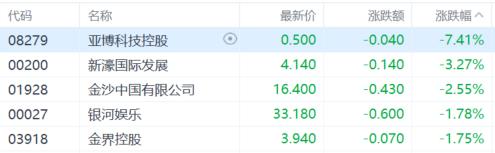 博彩股走低,亚博科技控股跌超7%,新濠国际发展跌超3%,金沙中国、银河娱乐、金界控股跟跌。
