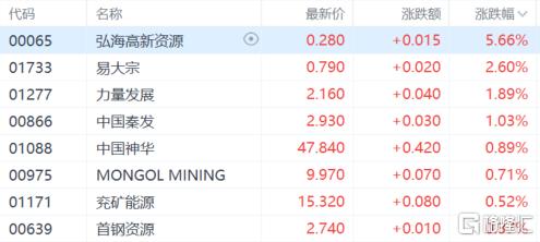 煤炭股表现活跃,弘海高新资源涨超5%,易大宗涨超2%,力量发展、中国秦发、中国神华等跟涨。