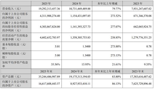 根据公司此前披露的2025年财报,2025年胜宏科技实现营业收入192.92亿元,同比增长79.77%;归属于上市公司股东的净利润43.12亿元,同比增长273.52%;扣除非经常性损益后的净利润43.04亿元,同比增长277.07%。