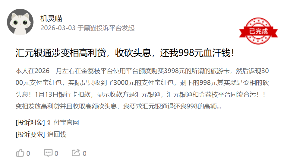 3月3日,有用户投诉:在金荔枝平台使用额度购买3998元旅游卡,号称返现3000元支付宝红包,实际只收到3000元红包,剩下的998元被解释为“权益费”,扣款方显示为汇元银通。
