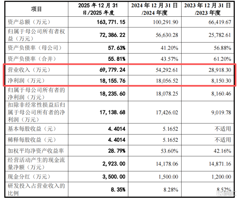 2023年、2024年及2025年(报告期),公司收入分别为2.89亿元、5.43亿元、6.98亿元,归母净利润分别为8160.46万元、1.81亿元、1.82亿元,近几年研发投入的比例略高于8%。