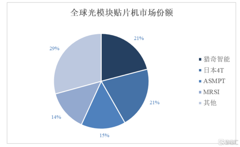 单看光模块贴片设备,2024年,按设备数量口径统计,猎奇智能光模块贴片设备市场份额为21%,与日本4T并列全球第一,头部三家企业占据57%的市场份额。