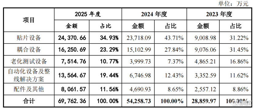 其中,贴片设备占比最高,其次是耦合设备,2025年这两块业务的占比分别为34.93%、23.29%。