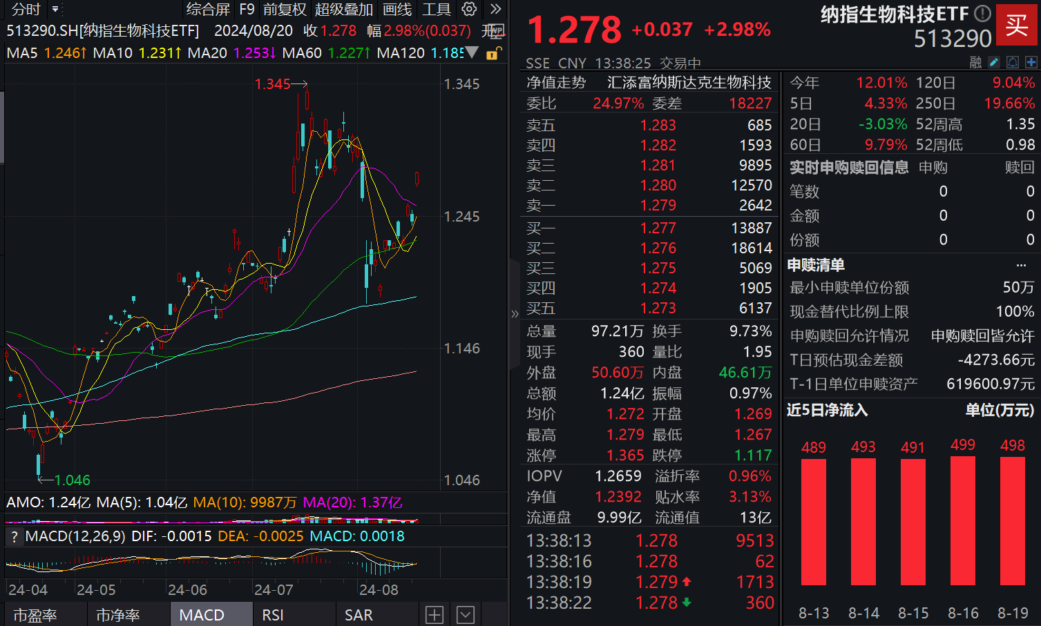 8月20日,纳指生物科技ETF(513290)放量暴涨3%,盘中成交额1.2亿元,赶超昨日全天成交额。