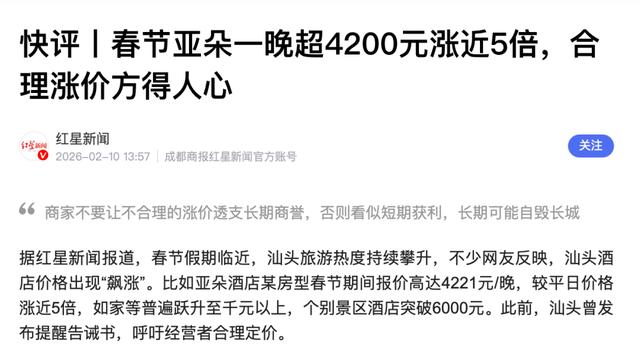 有媒体报道,春节汕头亚朵部分酒店价格暴涨5倍,最高超过4200元一晚。