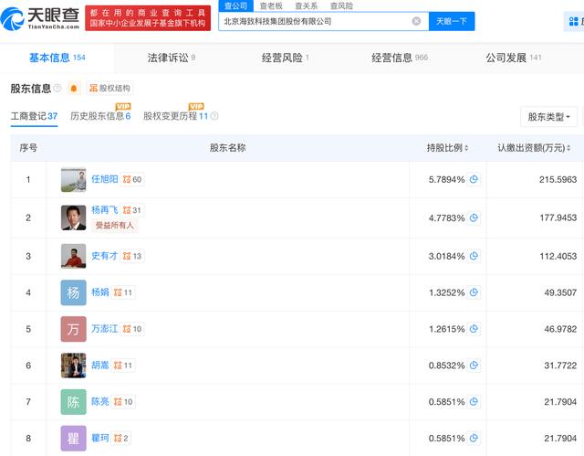 天眼查App信息显示,海致科技成立于2013年8月,前身为北京海智网聚信息技术有限公司。目前,该公司的注册资本约人民币3441.8832万元,法定代表人为杨再飞,主要股东包括任旭阳、杨再飞等。