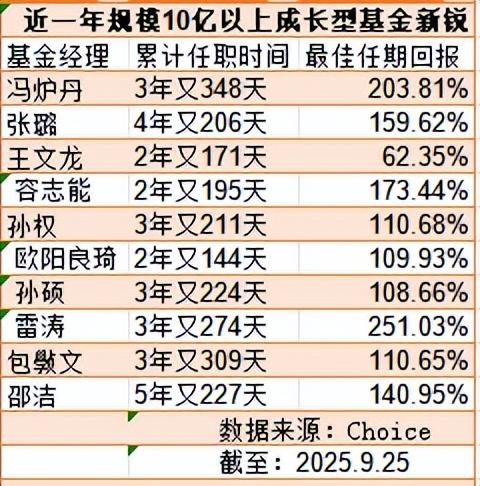 Wind数据显示,2024.923-2025.9.22期间,国内全市场22818只开放式基金,资产规模10亿以上,业绩超过100% 的116只权益基金中,有40只由任职5年及以下的基金新锐掌管,占比34.48%。