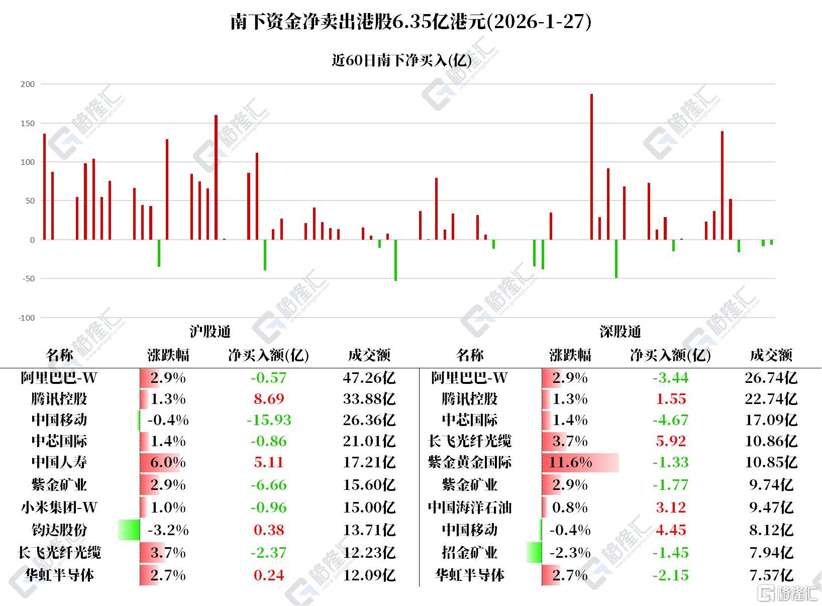 12、南下资金净买入腾讯,持续净卖出中国移动;