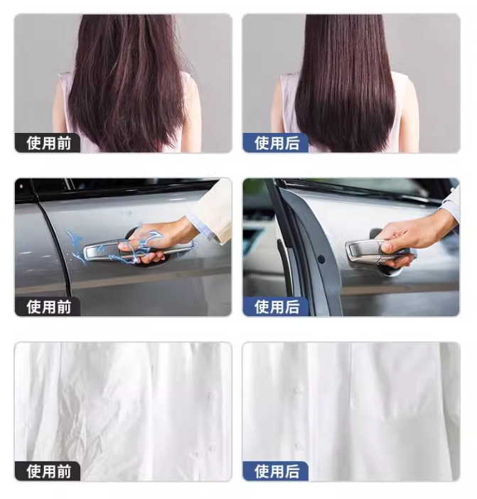 值得一提的是,根据其宣传效果,这种除静电措施还能保持衣物的清洁美观,避免静电导致的灰尘吸附与衣物粘连。有些产品还附加了对衣物的除菌、除味、抗皱的功能,另有部分产品宣称可以喷在头发或宠物毛发上,使毛发从毛糙变柔顺,颇有“一瓶在手,静电全走,快乐无忧”之感。