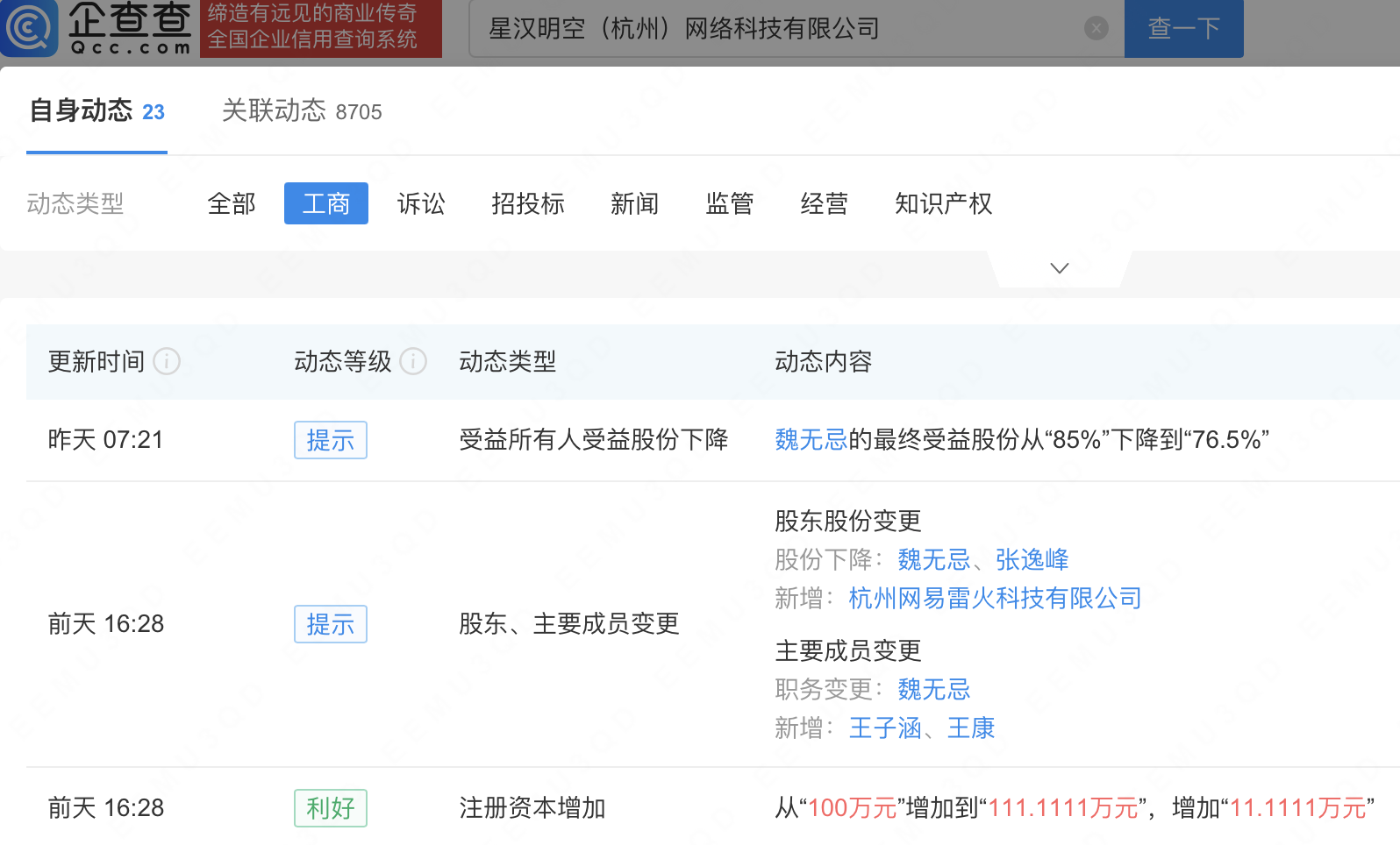 企查查APP显示,近日,星汉明空(杭州)网络科技有限公司发生工商变更,新增杭州网易雷火科技有限公司为股东,同时注册资本增至111.11万元。企查查信息显示,该公司成立于2021年,法定代表人为张逸峰,经营范围包含:动漫游戏开发;数字文化创意软件开发;数字内容制作服务(不含出版发行);软件开发等。