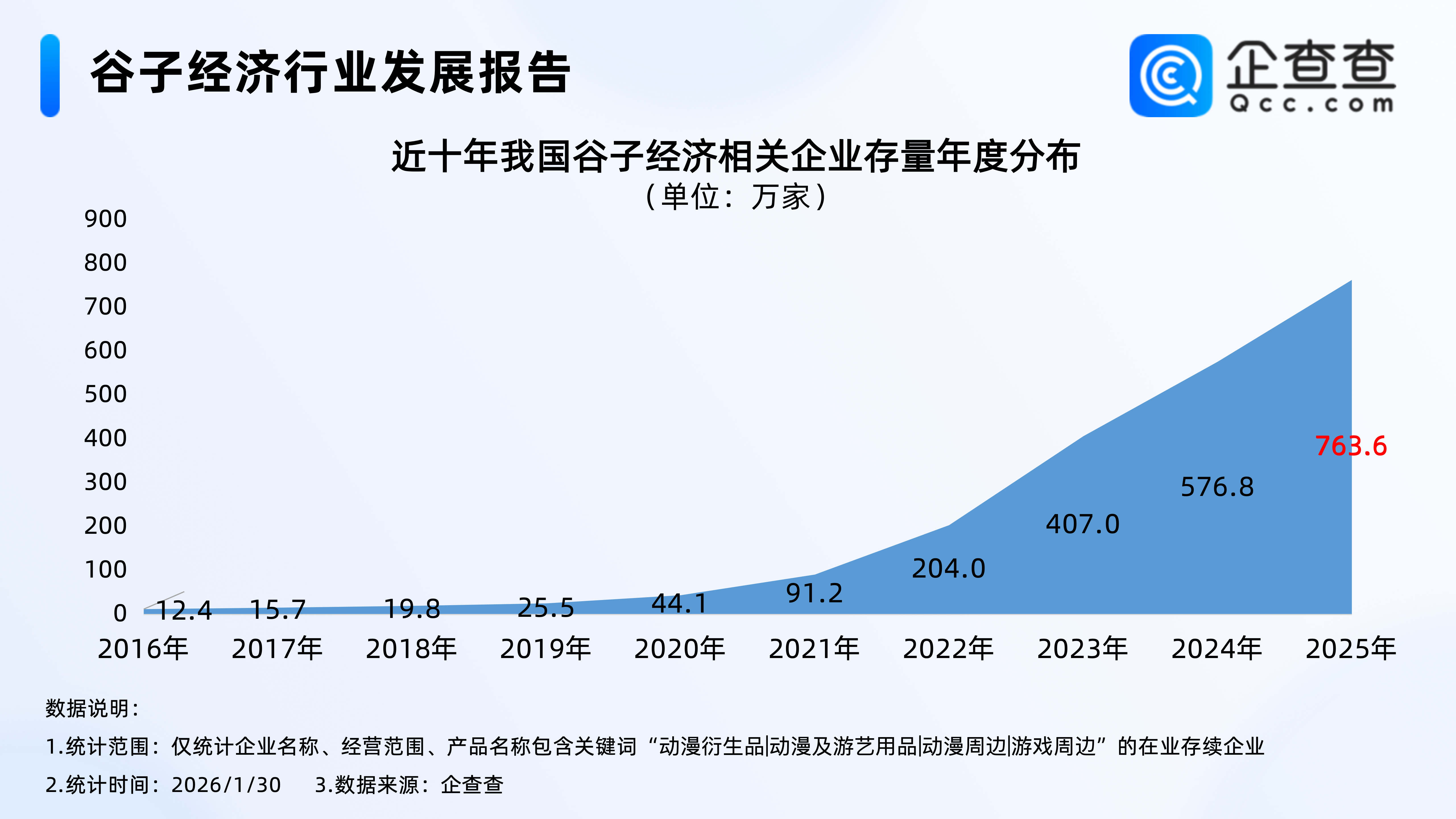 企查查数据显示,近十年,我国谷子经济相关企业存量逐年增加,2022年开始增速加快,2025年年底,我国在业存续763.6万家谷子经济相关企业。截至2026年1月30日,我国现存775.8万家谷子经济相关企业。