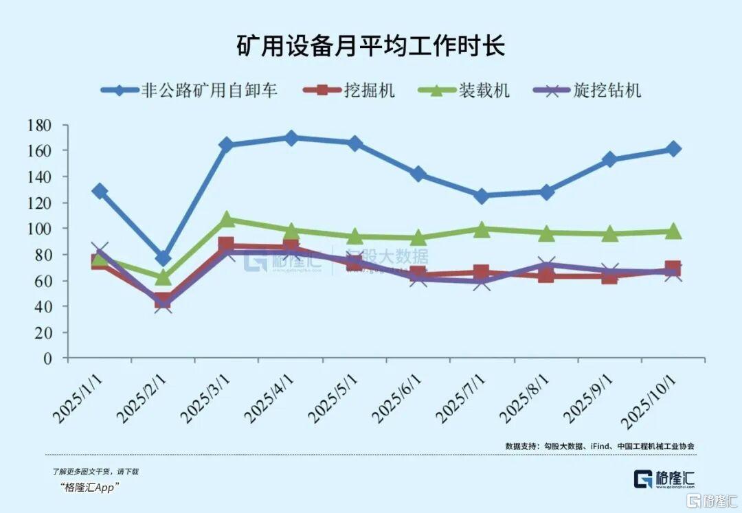 深地经济打开需求空间。自然资源部将深地探测列为"十五五"标准化制高点,在浅层资源逐步枯竭的背景下,深地矿产开发对隧道工程需求强烈。矿用机械中,非公路自卸车作为物料流转中枢,月均工作时长显著高于其他设备,3-4月峰值达164-170小时,凸显其刚需属性;隧道掘进机(TBM)凭借机械化、智能化优势,在矿山斜井掘进中应用日益广泛,全国矿用TBM保有量已突破110台,未来5年年新增量预计维持10%-20%增速。