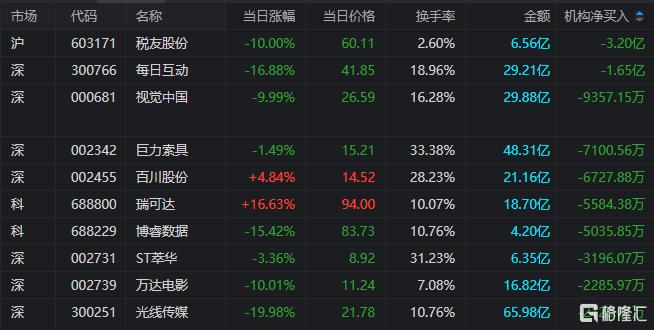 龙虎榜中涉及机构专用席位的个股中,当日净卖出额前三为税友股份、每日互动、视觉中国,分别为3.20亿元、1.65亿元、9357.15万元。