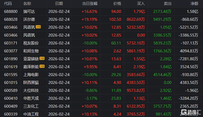 龙虎榜单日净买入额前三为华工科技、深南电路、湖南白银,分别为5.23亿元、4.21亿元、3.44亿元。