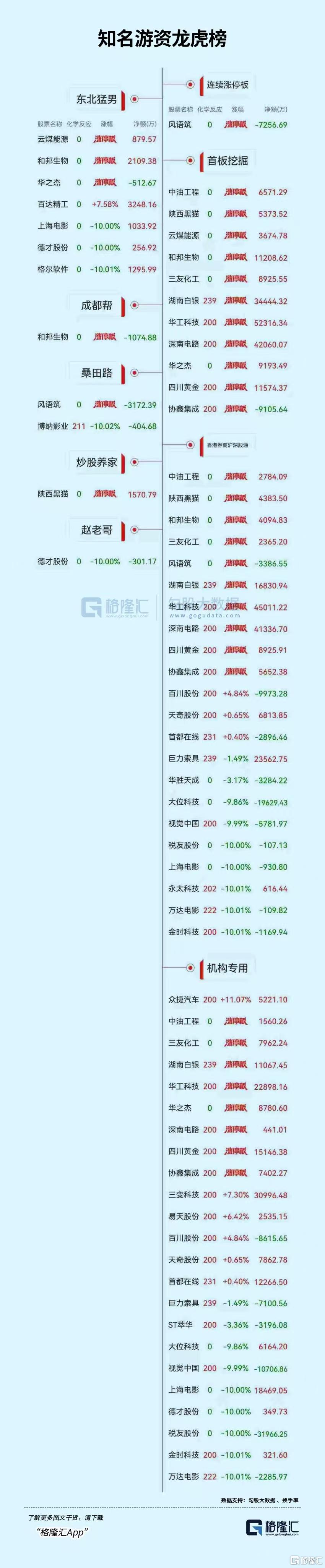 龙虎榜中涉及机构专用席位的个股中,当日净买入额前三为华工科技、上海电影、三变科技,分别为1.89亿元、1.85亿元、1.55亿元。