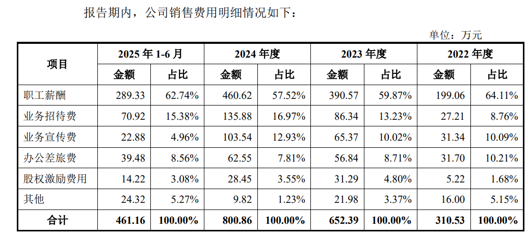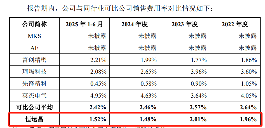恒运昌计划募资1.2亿元投向“营销及技术支持中心项目”,但花费上亿元建设营销及技术支持中心,是否必要?以过去几年的销售费用作为参考,恒运昌业绩增长迅猛的同时,销售费用并不高,2022年至2025年上半年分别为310.53万元、652.39万元、800.86万元及461.16万元,主要为销售人员薪酬,销售费用率为1.96%、2.01%、1.48%及1.52%,远低于可比公司均值的2.64%、2.57%、2.46%及2.42%。