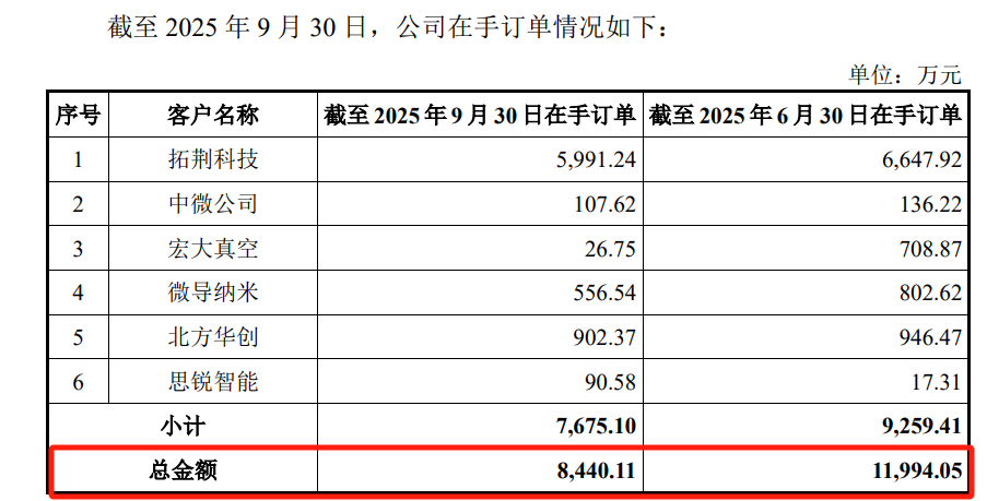 恒运昌的业绩命脉几乎完全系于拓荆科技一身。恒运昌2025年6月份的8039.68万元收入中 6065.91万元源自拓荆科技,占比 75.45%。这种高度依赖使得公司极易受到拓荆科技采购策略调整的影响。若拓荆科技因技术路线变更或自研零部件而减少对恒运昌的采购,恒运昌的营收将面临断崖式下跌。例如,2025年6月末公司在手订单1.2亿元,9月末骤降至8440万元,这一数据直观地反映了供应链的脆弱性。下游晶圆厂扩产节奏的短期调整,以及客户结合自身下游市场需求变化、内部备货计划调整及采购频率优化等因素,都可能导致订单的突然减少,而恒运昌对此似乎缺乏有效的应对措施。