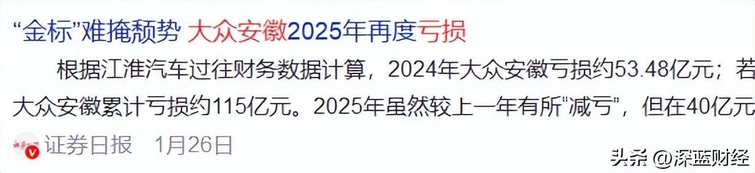 “证券日报”根据江淮汽车过往财务数据计算,2024年大众安徽亏损约53.48亿元,若叠加2023年亏损的18亿元,2023年至2025年三年间,大众安徽累计亏损约115亿元。
