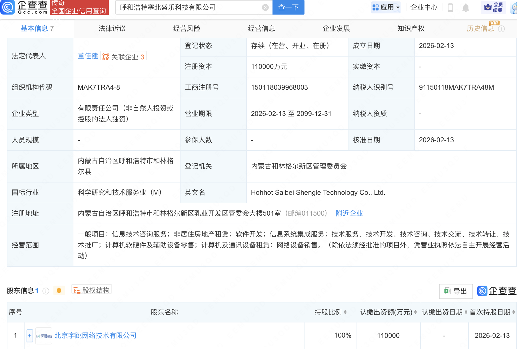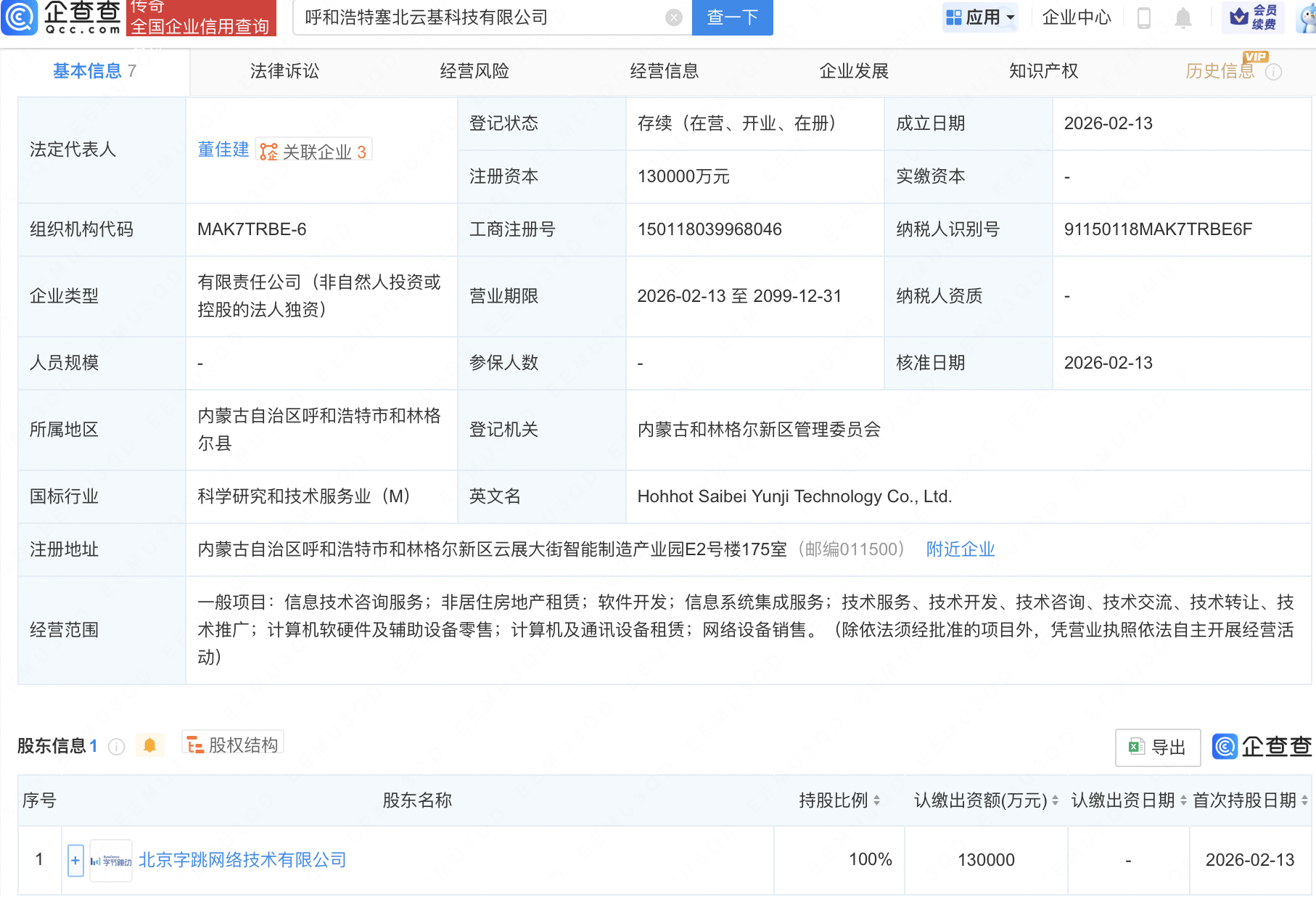 企查查APP显示,近日,乌兰察布雁北知微科技有限公司、呼和浩特塞北盛乐科技有限公司、呼和浩特塞北云基科技有限公司成立,法定代表人同为董佳建,注册资本分别为4亿元、11亿元、13亿元。企查查股权穿透显示,三者皆由北京字跳网络技术有限公司全资持股。