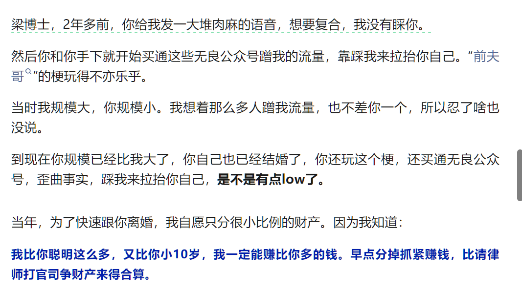 此次李蓓公开怒怼前夫,核心诉求是不满梁文涛长期蹭其流量、靠踩低自己抬高身价。李蓓在文中爆料,2023年梁文涛事业处于最低谷时,曾向她发送大量肉麻语音寻求复合,被自己拒绝后,对方便开始指使手下及水军,通过无良公众号蹭其流量,炒作“前夫哥”梗,歪曲事实抹黑自己。