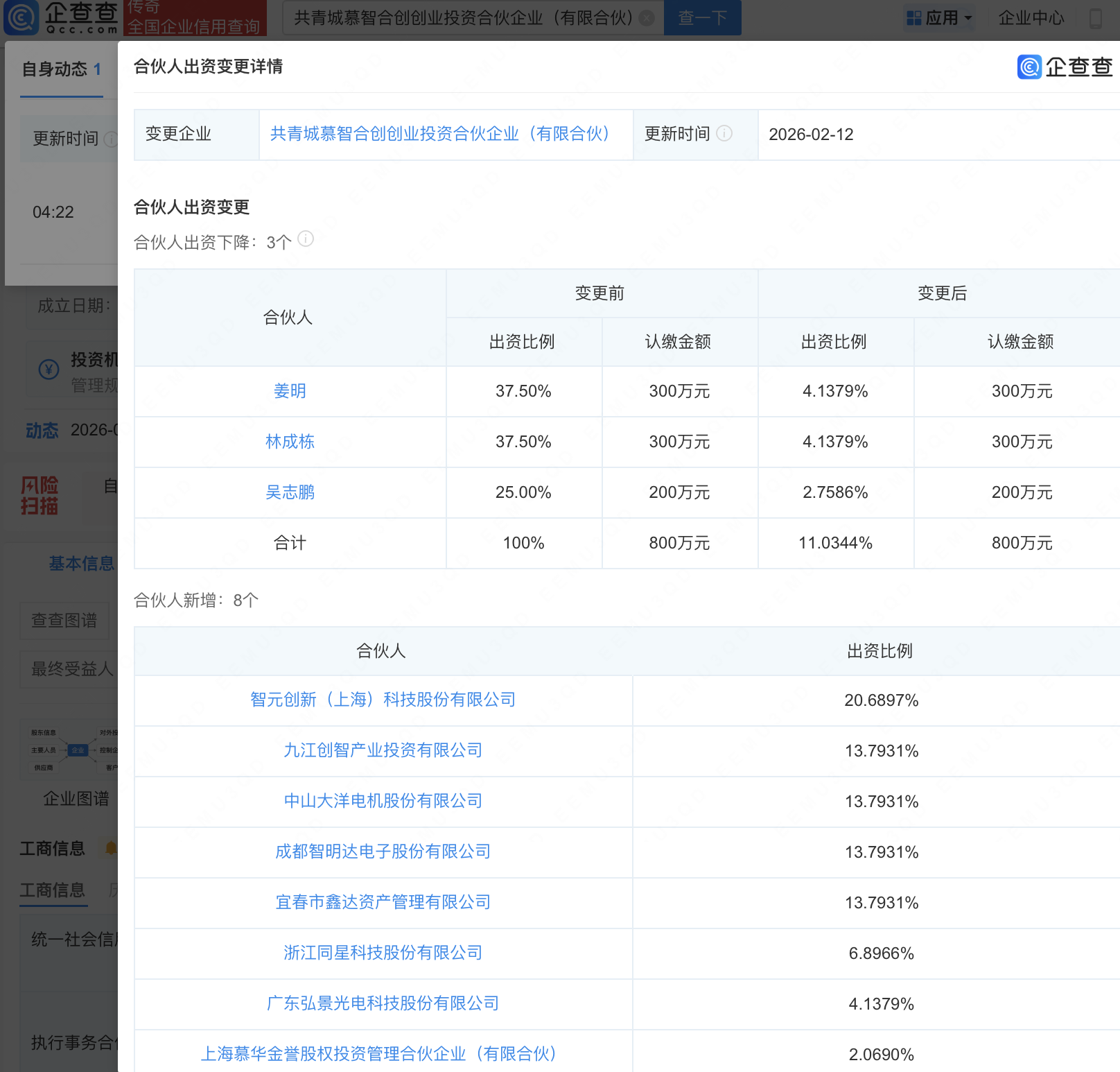 企查查APP显示,近日,共青城慕智合创创业投资合伙企业(有限合伙)发生工商变更,新增智元机器人关联公司智元创新(上海)科技股份有限公司、大洋电机(002249)、同星科技(301252)、智明达(688636)等为合伙人。企查查信息显示,该企业成立于2026年2月,经营范围包含:以私募基金从事股权投资、投资管理、资产管理等活动。