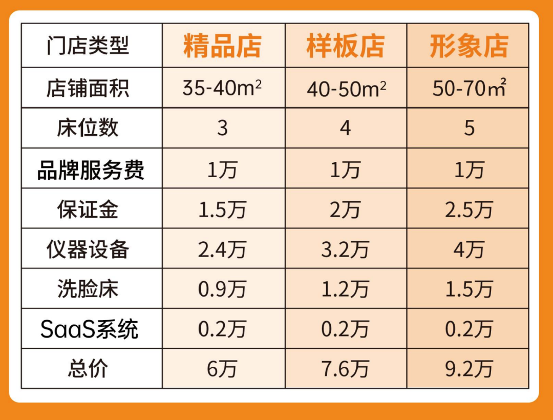 加盟开店成本相对较低或是其扩张迅速的原因之一。招商政策文件显示,依据门店面积和床铺数量不同(3-5张),其加盟费用(含仪器、品牌服务费等)在6-9.2万不等。招商人员表示,算上店租装修等费用,开一家三十多平的洗脸熊门店资金成本约在15万左右。