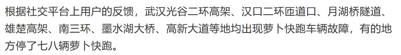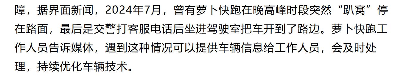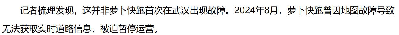 值得注意的是,这并非萝卜快跑首次出现故障。据《界面新闻》报道,2024年7月曾有萝卜快跑在晚高峰时段突然“趴窝”停在路面,最后是交警打客服电话后坐进驾驶室把车开到了路边。另据《经济参考网》报道,2024年8月萝卜快跑还曾因地图故障导致无法获取实时道路信息,被迫暂停运营。