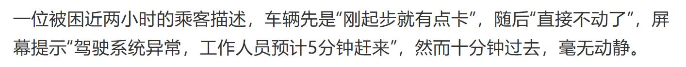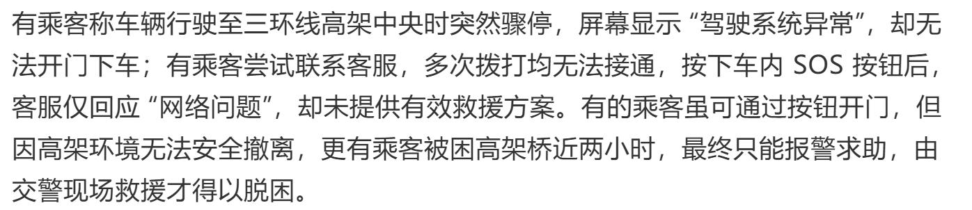 据《钛媒体》等报道,多位被困乘客描述,按下车内SOS按钮后,客服仅回应“网络问题”,却未提供有效救援方案。有乘客拨打多次官方客服电话才被接通,但救援人员迟迟未能到达现场。车辆屏幕提示“驾驶系统异常,工作人员预计5分钟赶来”,然而十分钟过去毫无动静。