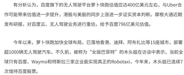 据《同壁财经》报道,有分析认为,百度旗下的无人驾驶平台萝卜快跑估值应达400亿美元左右。摩根大通此前发布研报称,对百度云、无人驾驶业务进行重估,给予百度796亿美元估值。被称为“女版巴菲特”的木头姐也表示,当前全球只有百度、Waymo和特斯拉三家企业能实现真正的Robotaxi。