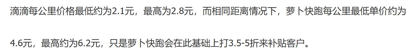 据《投融界》分析,如果不使用优惠折扣,萝卜快跑的价格其实是远高于滴滴快车的——滴滴每公里价格最低约为2.1元,最高为2.8元,而相同距离情况下,萝卜快跑每公里最低单价约为4.6元,最高约为6.2元。目前萝卜快跑主要通过3.5-5折的补贴来吸引客户。