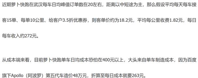 难以持续的补贴模式。近期萝卜快跑在武汉每车日均峰值订单数在20左右。假设平均每天每车接客15单、每单10公里、给客户3.5折优惠券,则客单价约为18.2元,平均每公里收费1.82元,每日每车收入约272元。而从成本端来看,目前萝卜快跑单车日均成本恐怕在400元以上。这意味着每辆车每天亏损超过128元。按照武汉投放400多辆无人驾驶汽车的规模计算,仅武汉一地每日亏损就超过5万元,年亏损近2000万元。