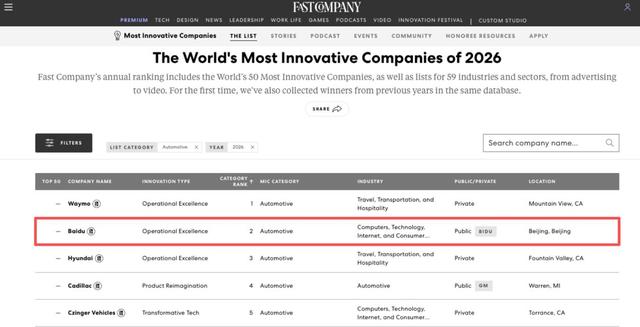 截至2025年10月底,萝卜快跑全球自动驾驶测试与运营总里程已突破2.4亿公里,其中全无人里程超过1.4亿公里,服务覆盖全球22座城市,累计完成出行订单超1700万单。2026年3月,萝卜快跑入选《Fast Company》“最具创新力企业”榜单Automotive类别全球第二,成为唯一进入该榜单前三的中国企业。