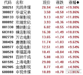 影视院线股持续走高,光线传媒、华谊兄弟20CM涨停,华策影视、欢瑞世纪、博纳影业、横店影视、万达电影跟涨。