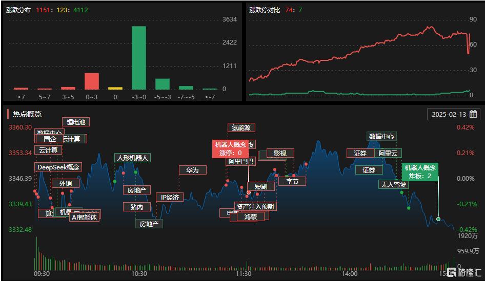 2月13日,A股主要指数小幅下跌,截至收盘,沪指跌0.42%报3332点,深证成指跌0.77%,创业板指跌0.71%。全天成交1.85万亿元,较前一交易日增量1151亿元,全市场超4100股下跌。