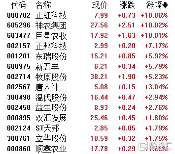 猪肉概念股拉升,正虹科技、神农集团、巨星农牧涨停,正邦科技、东瑞股份、新五丰等跟涨。