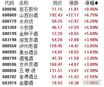白酒股回暖,岩石股份涨停,山西汾酒、水井坊、今世缘金、种子酒、迎驾贡酒等跟涨。