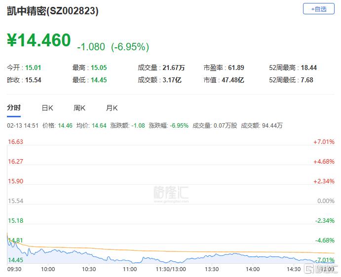 凯中精密逆势下跌超6%,报14.46元,总市值跌破50亿元。