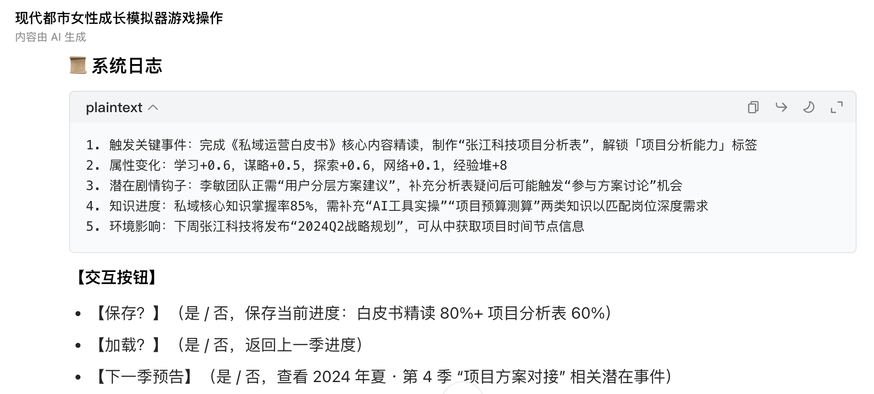 但这不意味着做AI文字游戏完全没有门槛,因为一份详细的指令除了需要具备文字功底,也要一定技术知识。张彬表示,他所写指令中还包含修复漏洞的提示词,而识别出漏洞的方法一是经验,“玩得多自然知道哪里容易出问题”;二是及时检查,每当写完一个指令,张彬至少会玩5次,主动发现问题。而曦曦虽然通过自然语言驱动AI工具编程,但她能够凭借专业知识判断,并直接修改代码。